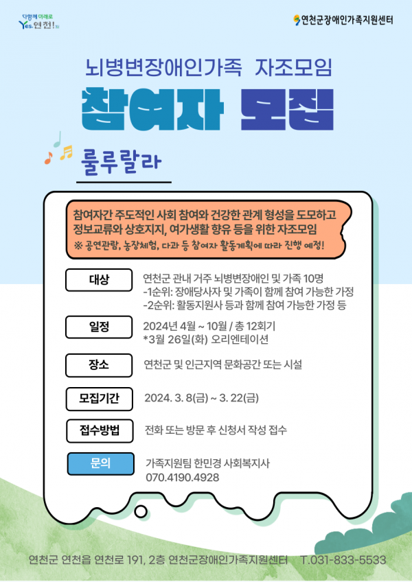 7. 신청문의: 연천군장애인가족지원센터 가족지원팀(☎031-833-5533(대표) / ☎070-4190-4928(직통))